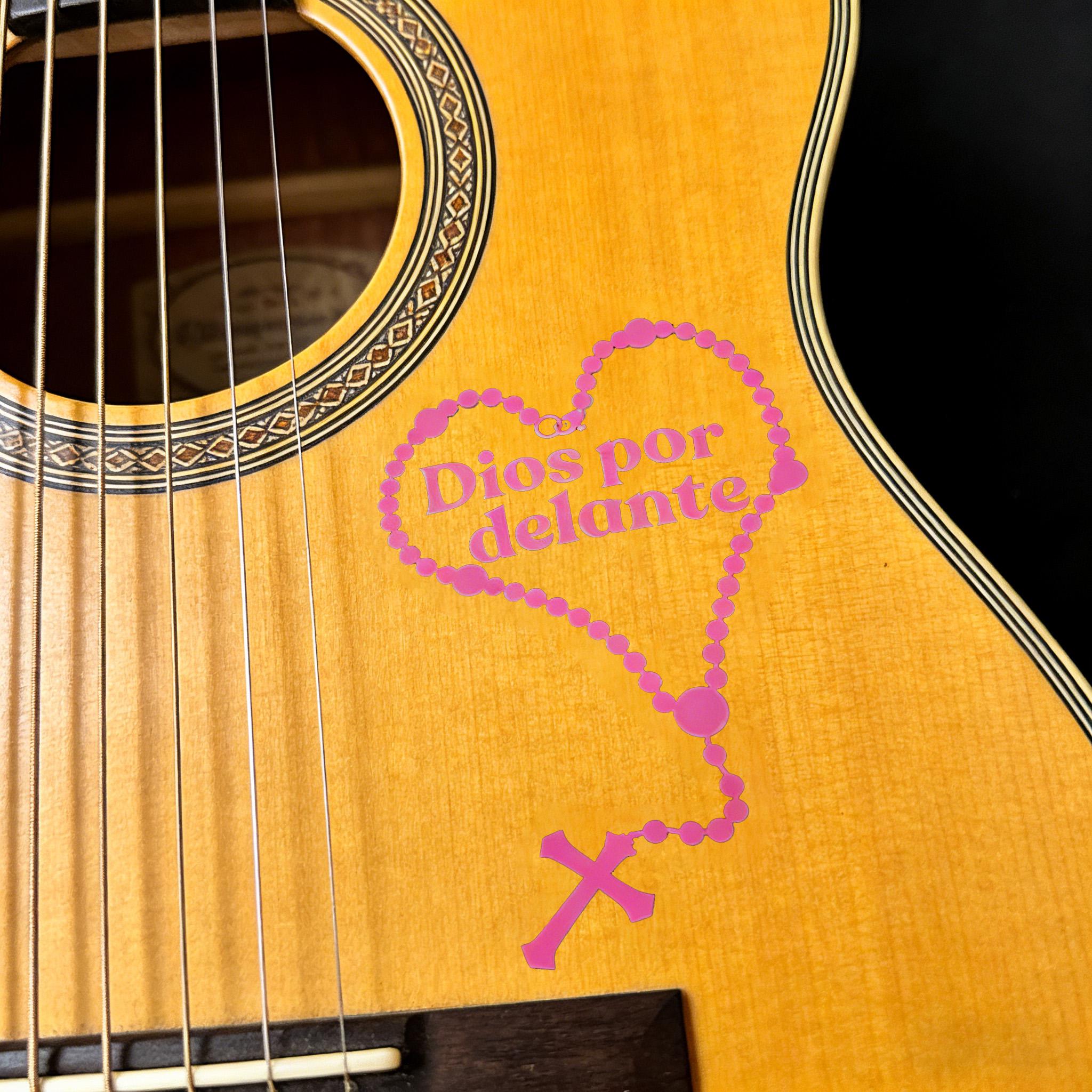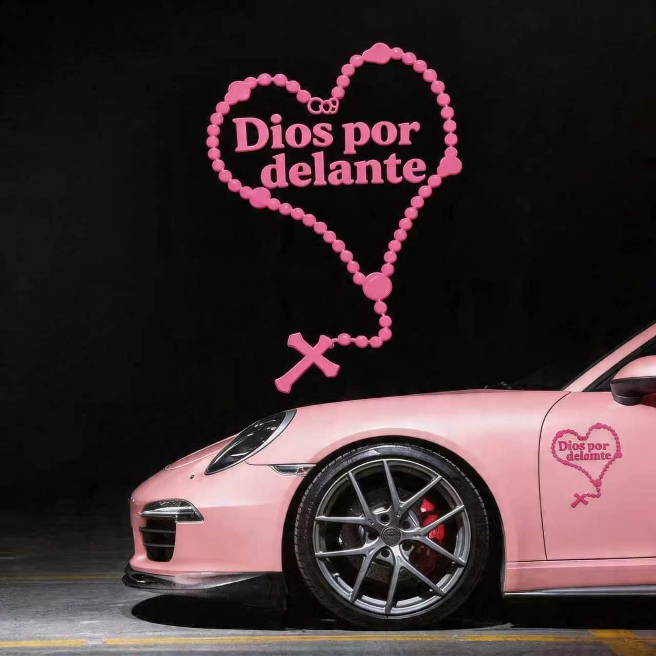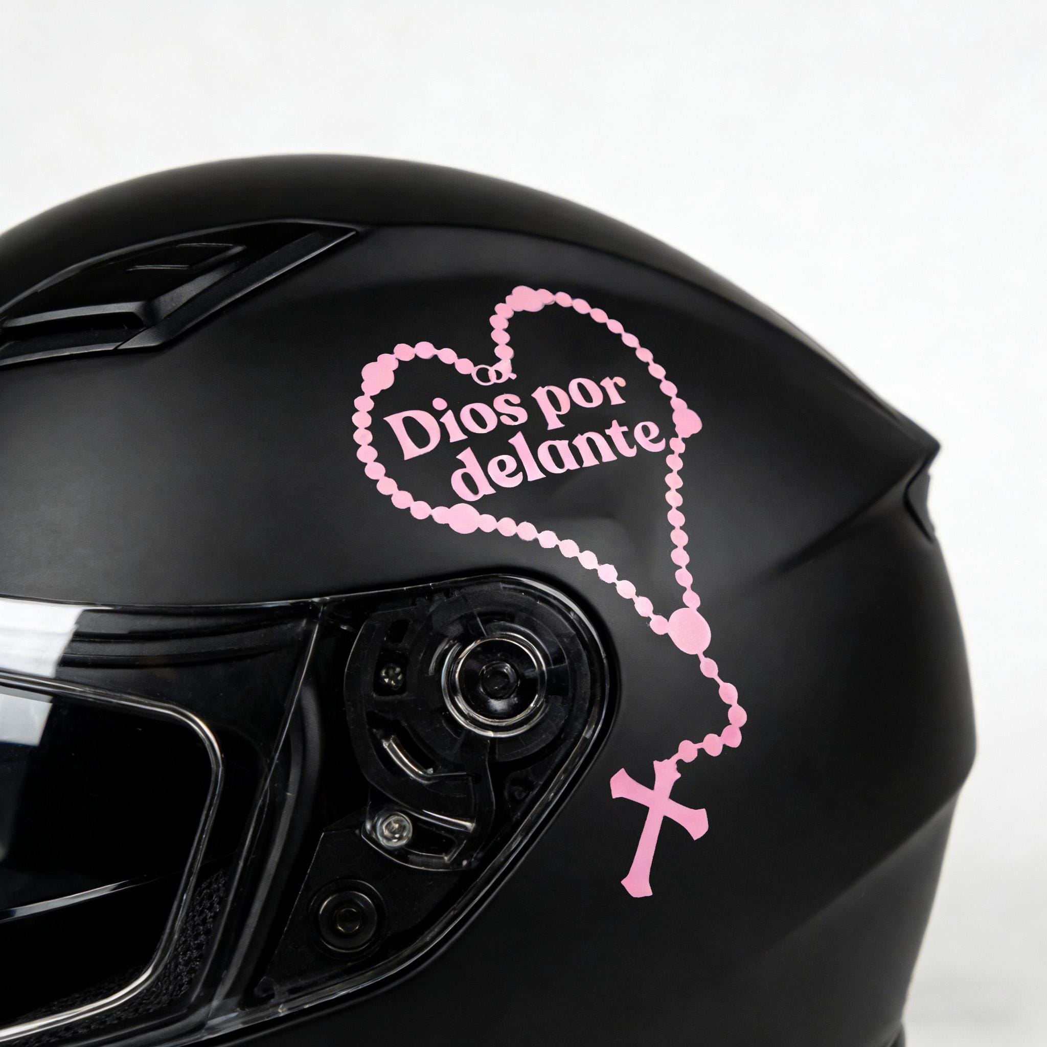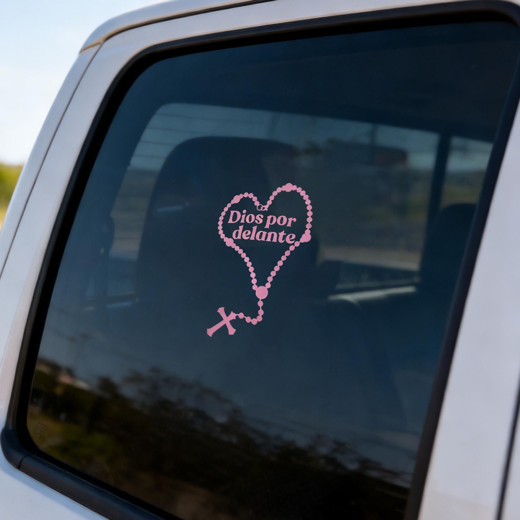 Add a meaningful touch to your car or favorite space with this elegant “Dios por delante” Rosary Heart Decal.